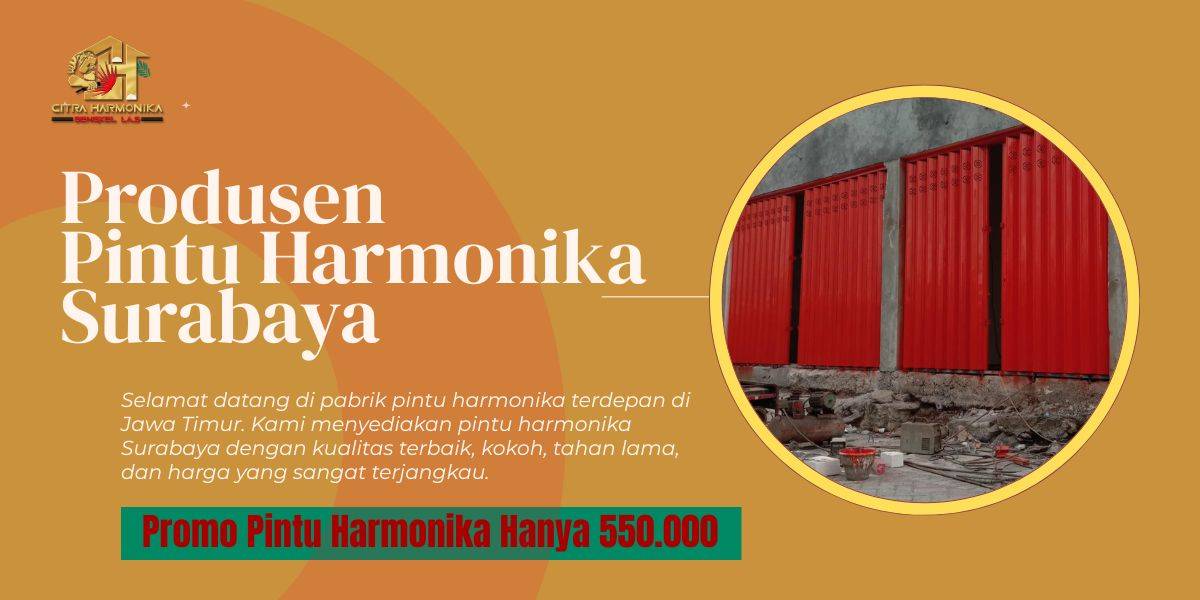 Kami produsen pintu harmonika terbaik dan termurah di Surabaya sejak 2000. Melayani seluruh Indonesia dengan bahan berkualitas SNI. Hubungi kami sekarang untuk produk terpercaya dan harga bersaing!